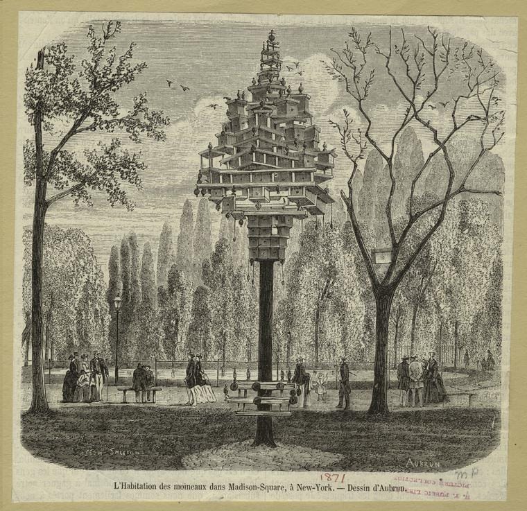 The small, brown, black, gray, and white birds—Passer domesticus—easily blend into street tree branches, building facade bricks, roof eaves, the corners of window sills, and untended tree beds where they take dust baths. Much like the people who built this environment, they were not always here. Their introduction to the United States can be traced back to the mid-19th century, when they were identified as a solution to insect infestations, especially the inchworm that was destroying trees. In the 1850s, after an initial release of house sparrow pairs perished, another 100 were collected in England by naturalist Nicholas Pike. Many of these were released in Brooklyn’s Green-Wood Cemetery. It was a time of acclimatization societies that attempted to improve on nature by introducing new fauna across the globe, but more often than not, they unbalanced the local environment. In this case, the sparrows flourished to almost alarming numbers. Representatives from New York City’s burgeoning bird population were exported or flew to other cities. They feasted on insects; they also foraged the horse oats that fell out of feed bags on the streets. They survived in the heat and the cold.