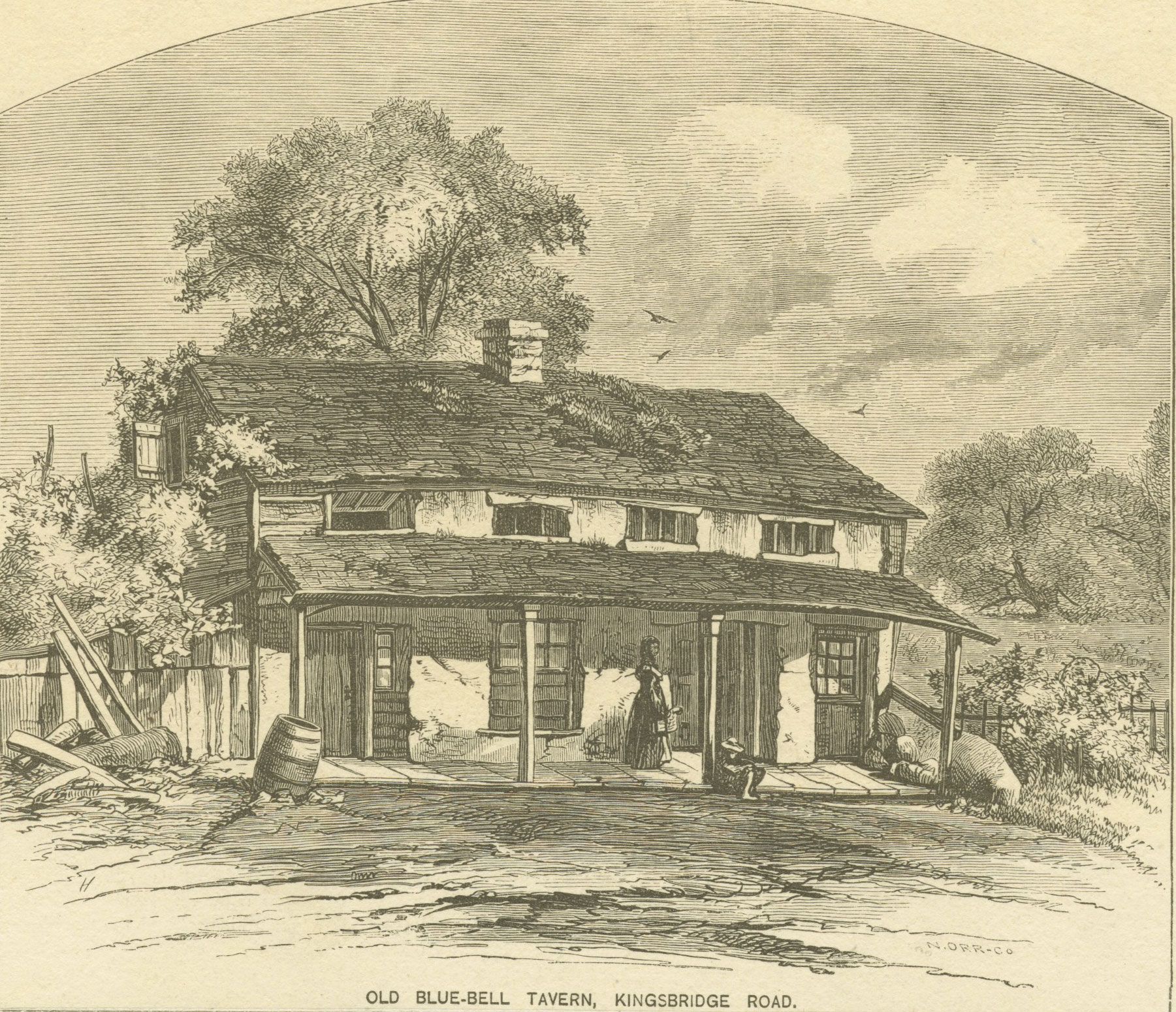 - In the 18th century, the Blue Bell Tavern at today’s 181st Street and Broadway in Manhattan was a popular spot for travelers, most notably members of the Continental Army during their flight from the British in 1776. The head of the statue of King George that was torn down in Bowling Green was even skewered on a pole in front of the famed inn. It was completely demolished by 1915, although, as the Bowery Boys blog relates, it “lived on long after its demolition in a most curious way — as a well-known miniature housed at the Museum of the City of New York.”